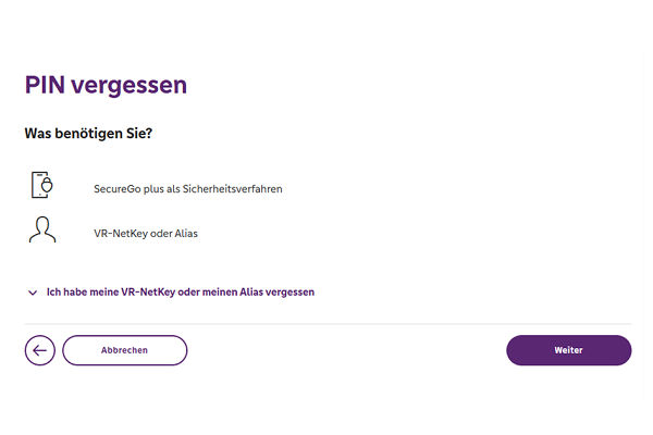 Sollte einmal die persönliche PIN nicht vorliegen, kann diese ganz bequem in Anmeldebereich Ihres Online-Bankings per „PIN vergessen"-Funktion angefragt werden.